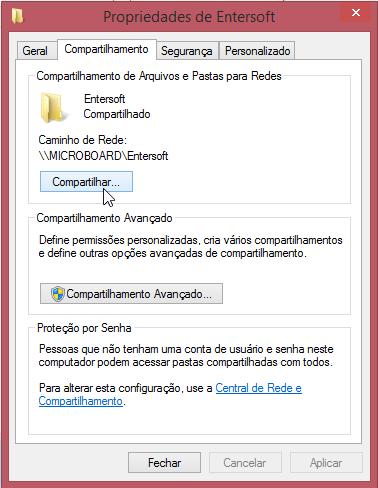 5) Em seguida, clique no botão “Compartilhar”. Observe que na próxima tela foi exibido o caminho do compartilhamento, como \\MICROBOARD\Entersoft A palavra “MICROBOARD” corresponde ao nome do computador que estamos utilizando como servidor neste exemplo.