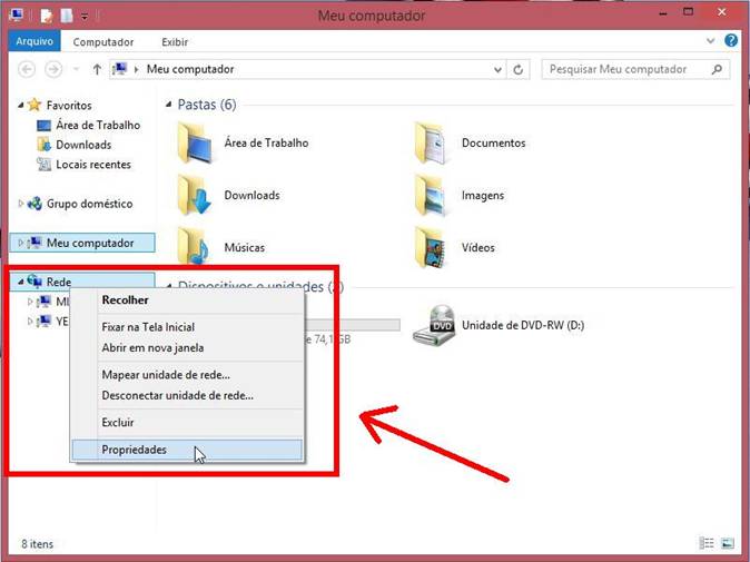 de trabalho e abra o “Meu Computador” 2) No lado esquerdo da tela, clique com o botão direito do mouse sobre a opção “Rede” e depois clique na opção “Propriedades”