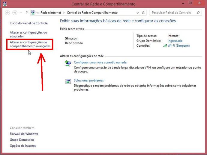 3) Na tela a seguir, clique na opção “Alterar as configurações de compartilhamento avançadas”.
