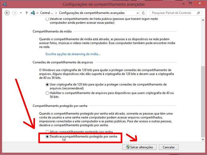 5) Role para baixo e marque a opção “Desativar compartilhamento protegido por senha”. Depois clique em “Salvar alterações” e feche esta tela.