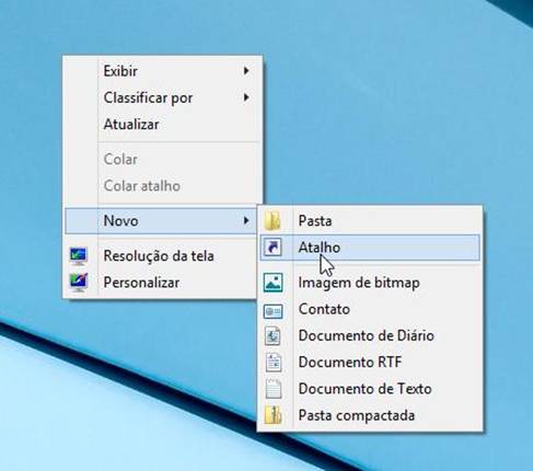Instrução Nº 5 Criando o ícone do sistema na área de trabalho Depois de instalado o pacote de runtime, basta criar um ícone chamar o sistema em cada computador da rede. 1) Vá para a área de trabalho, clique com o botão direito do mouse em qualquer lugar vazio, selecione a opção “Novo”, e selecione a opção “Atalho”.