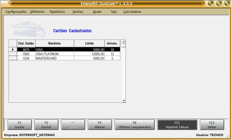 2) Selecione o cartão desejado na grade e clique no botão “F11 - Imprimir Fatura”